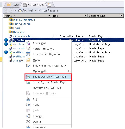 - Right click on MyCustom.master -> Edit File in advanced mode.