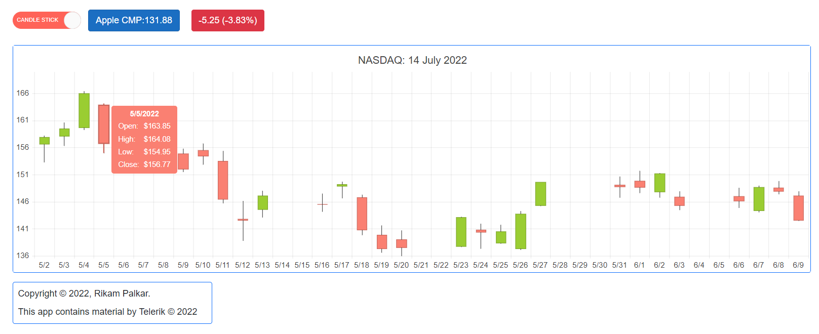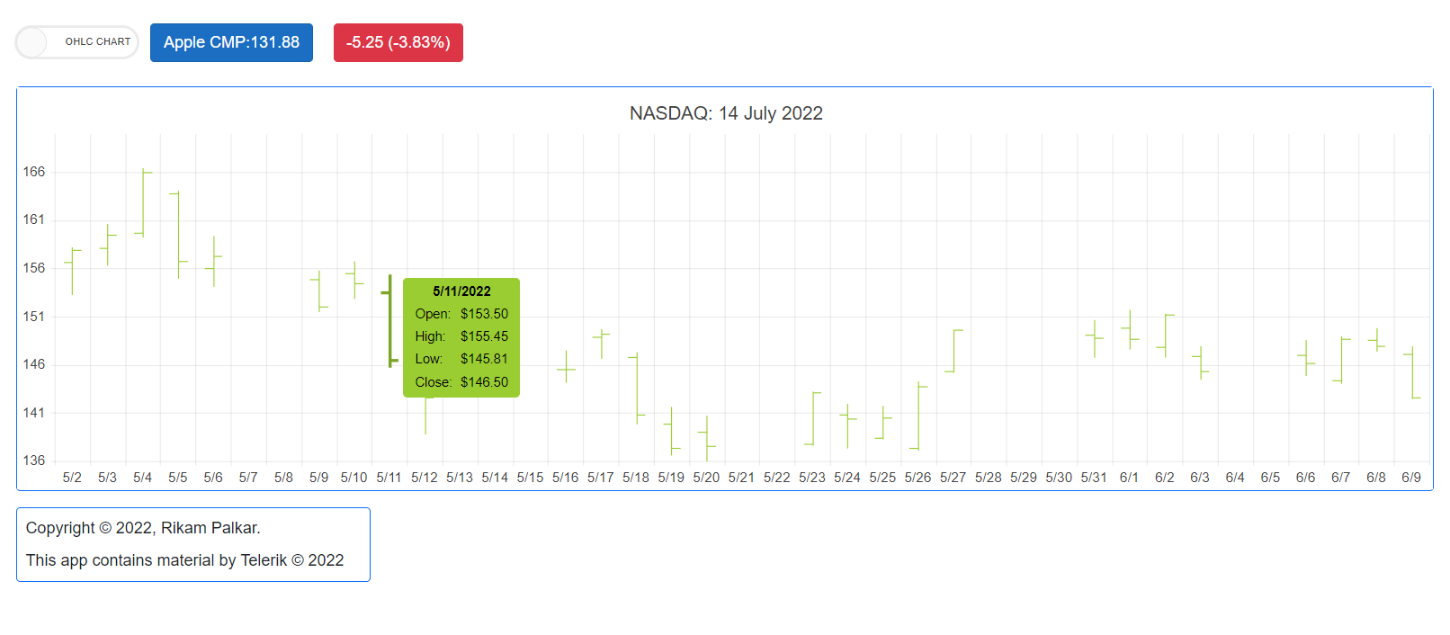 Now we know how to create candlestick and OHLC charts in Blazor, how to style them based on their type and how to deserialize json into objects. We saw how to add telerik components in your application.