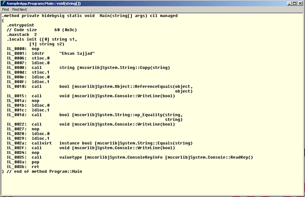 Now, let’s examine what is the IL generated for the string equality checking that is done using the equality operator. We can see there is no ceq instruction being called, which we saw in the previous posts that for the value types and reference types those instructions are executed when we check for equality, using == operator, but for the string, we have to call to a new method named as op_equality(string, string), which takes two string arguments. We have not seen this kind of method before, so what is it actually?