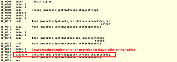 If we look at IL generated for s1.Equals(s2), there are no surprises, as it is calling Equals method but this time it is calling the method implementation of IEquatable<string>, which takes a string as an argument.