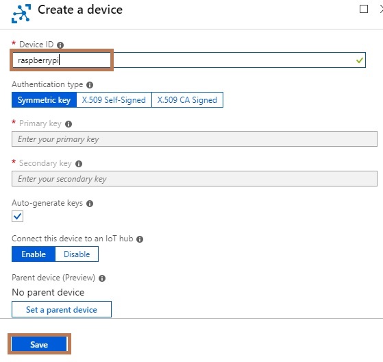Create an IoT device named as "raspberrypi" and select the authentication type.