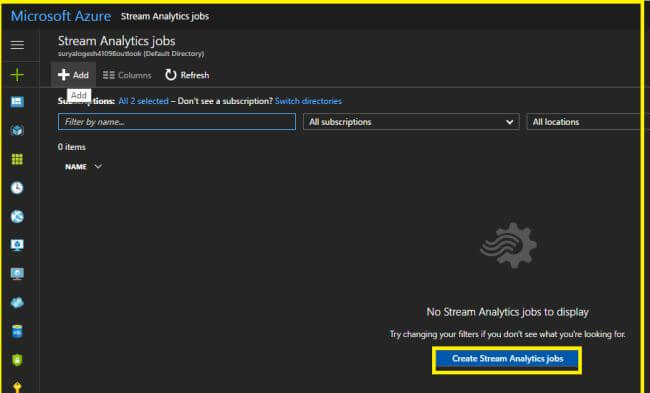 After creating HDInsight and storage account, search for stream analytics in search menu and click "Create Stream Analytics jobs".