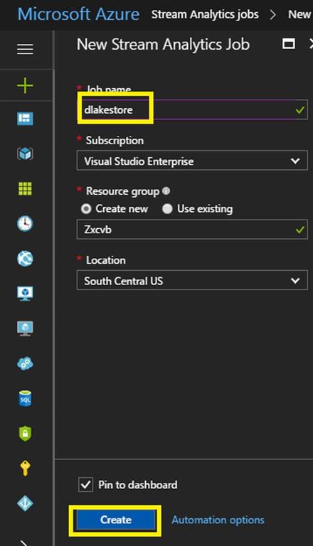 Now, we need to provide a small values for the stream analytics job and provide a unique name for the job name and create a new resource group with the location of the datacenter and click Create.