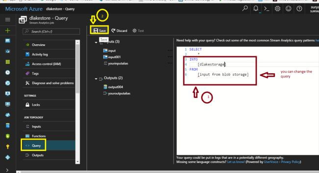 I have provided an overview for running the stream analytics jobs only. We can run a query from the query tab given below, so that we can replace the queries for the input and the output.