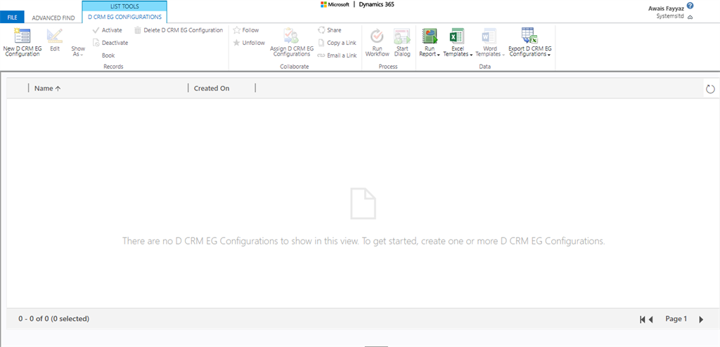 Now, select “New D CRM EG Configuration” from the toolbar and click on Results on the toolbar. A blank result page will be shown.