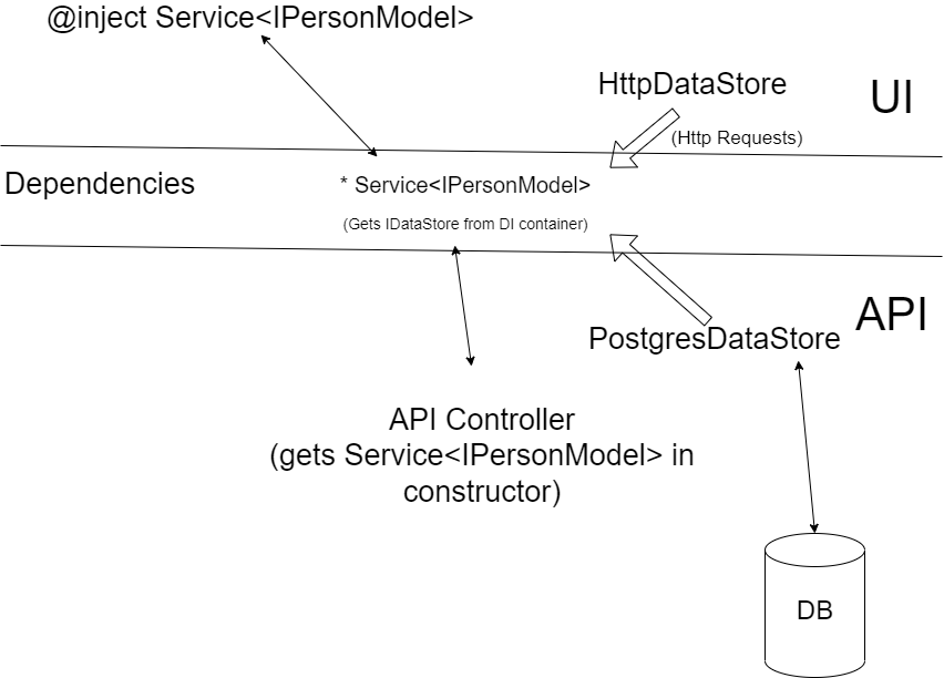This class can be registerd as the IDataStore type in the UI project, and then when you inject a Service, it will make HTTP requests under the hood when accessing data. Additionally, you can add caching in this DataStore layer, if using something like a Redis cache, localStorage caching on a web app, etc.