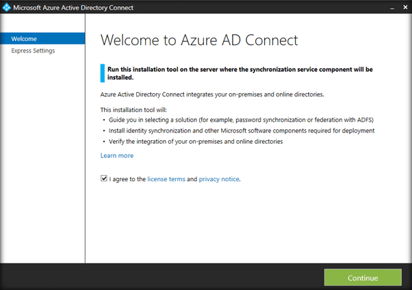 This will spin up Azure Active Directory Connect Wizard. Accept the agreement and proceed.