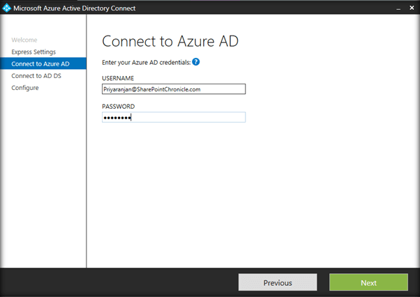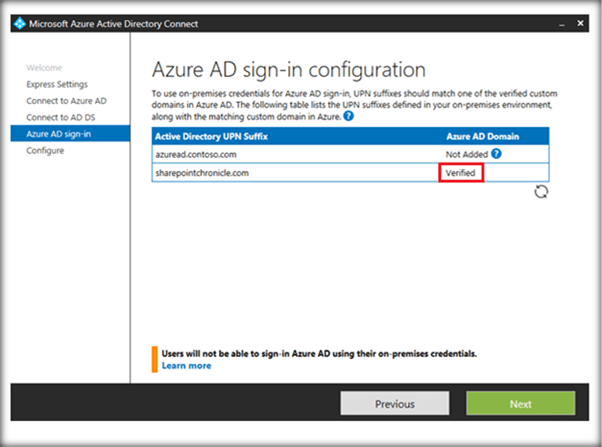 Here you can see that in order to perform an Azure ad sign in, the UPN prefixes which we had added to the on premise Active directory should match with the verified public domain in azure (SharePointChronicle.com).