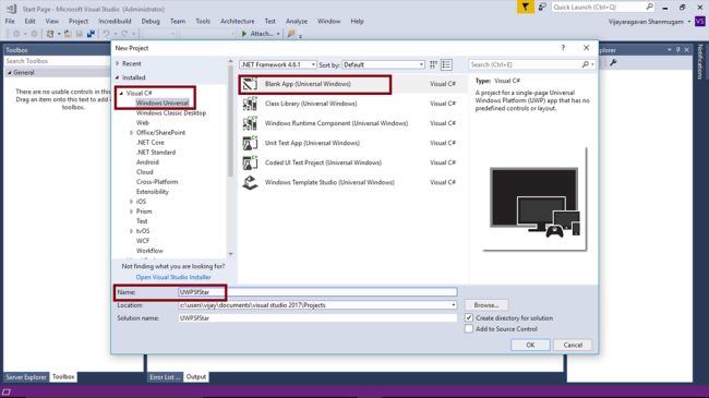 Open Visual Studio 2017. Go to Start -> New Project-> select Windows Universal (under Visual C#) -> Blank App (Universal Windows) -> Give suitable name to your app (UWPSfStar)->OK.