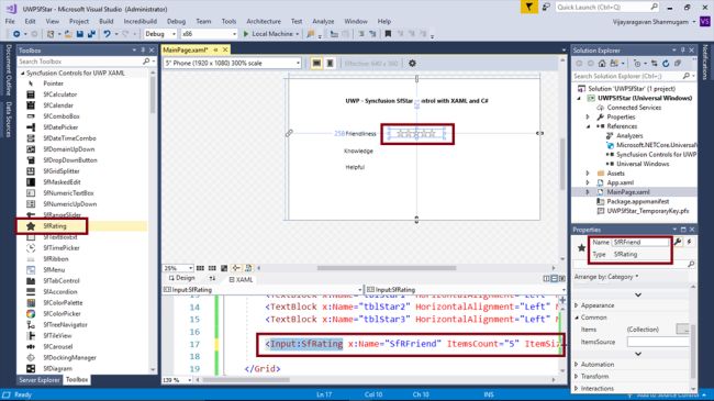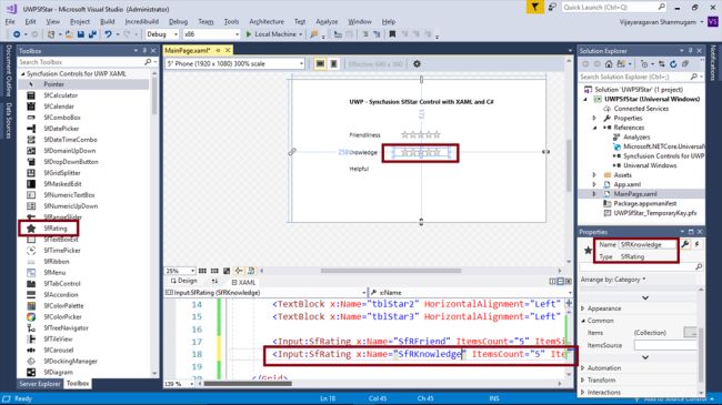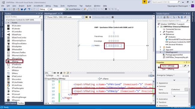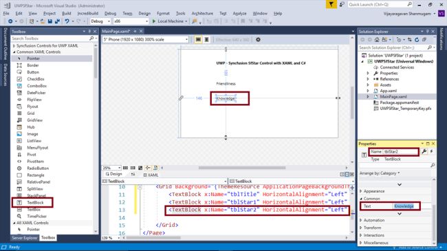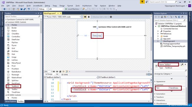 - <TextBlock x:Name="tblTitle" HorizontalAlignment="Left" Margin="146,45,0,0" TextWrapping="Wrap" Text="UWP - Syncfusion SfStar Control with XAML and C#" VerticalAlignment="Top" Height="27" Width="375" FontWeight="Bold" />