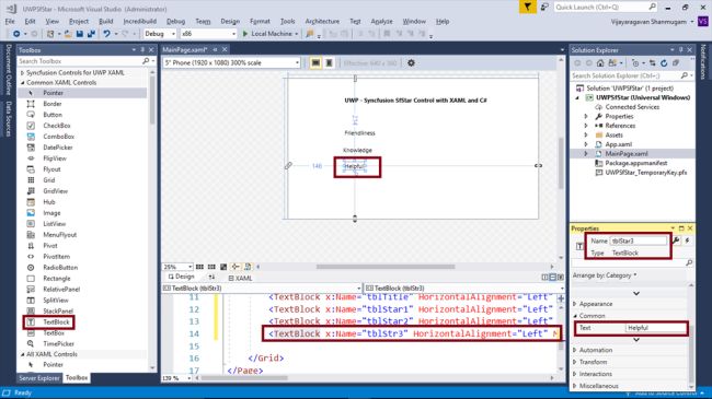 Add 3 TextBlock controls and change the name and text property for sample - Rating, Friendliness, Knowledge, Helpful.