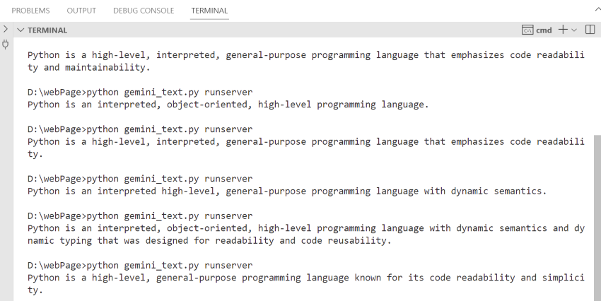 - response = model.generate_content("what is python in one sentence?", generation_config=genai.types.GenerationConfig(temperature=1)): This line generates content based on the given prompt, "what is python in one sentence?". It seems to provide a configuration for the generation process, setting the temperature to 1. The temperature parameter controls the randomness of the generated content. Lowering the temperature towards 0 will result in more predictable and conservative outputs, as the model will tend to choose the most likely words. On the other hand, increasing the temperature towards infinity will make the model more exploratory, leading to more varied and sometimes less coherent outputs.