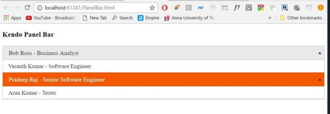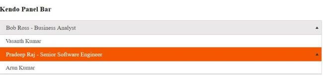 From the above code, you can observe that the template property is used while defining the kendo panel bar. The template is decorated/customized in the way which is used to display the firstname and lastname of the employee with his designation.