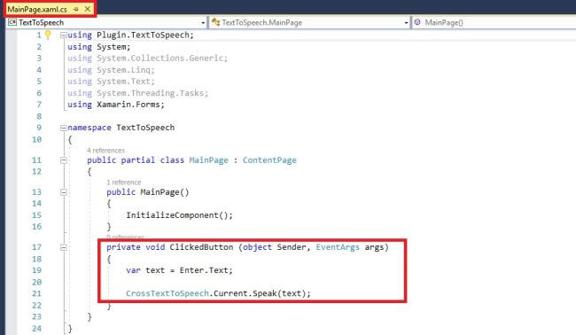 - <Button Text="Speek" Clicked="Clicked Button"/>