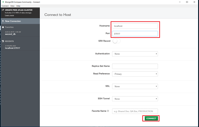 Now, open the MongoDB Compass which has the responsibility of user required access and favorite connections. When you opened the Compass, then it will ask you few authentication credentials for connecting localhost along with its port.