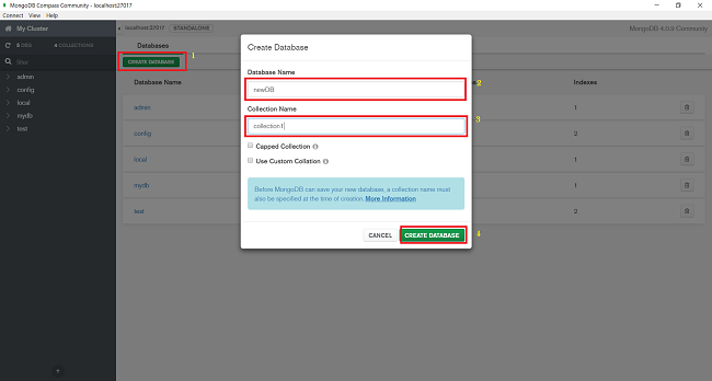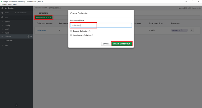 - Let’s create a new Database by clicking the “Create Database” button which is located at the top right side of the Compass Home. In the Create Database dialog, you can give the Database Name and follow by the Collection name for the first collection like “newDB” and “collection1” then click “CREATE DATABASE” button.