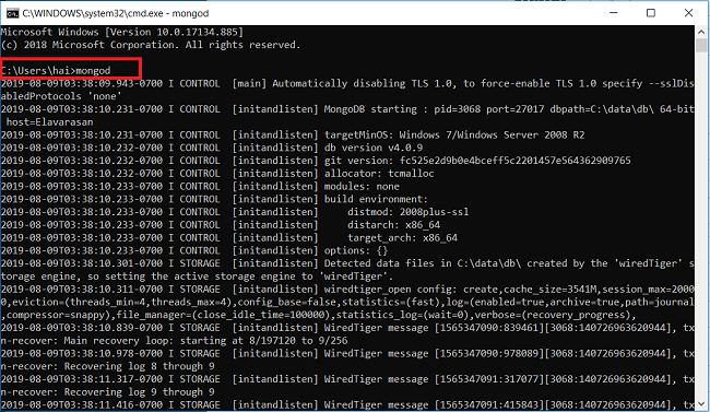 First of all, we run the “mongod” at CMD to enable the MongoDB instance. It handles all MongoDB server tasks such as requests, responding to client, and memory management.