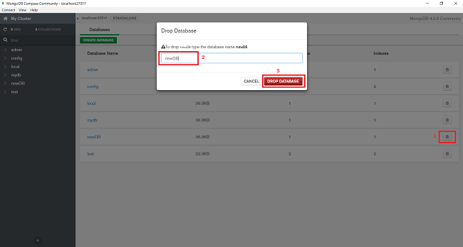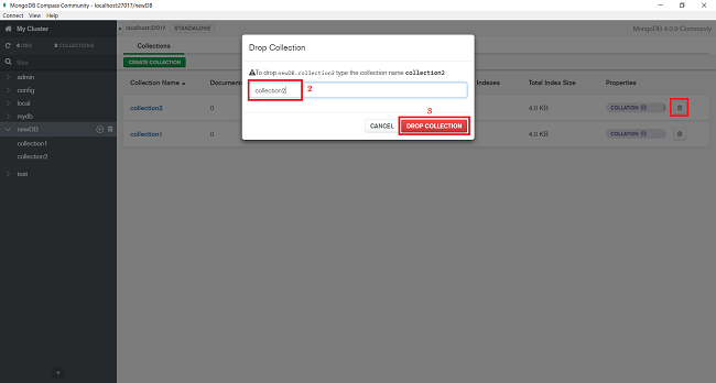 From the Collection tab, click on the trash icon. In the Drop Collection dialog, just give the exact collection name which needs to delete then click “DROP COLLECTION” button.