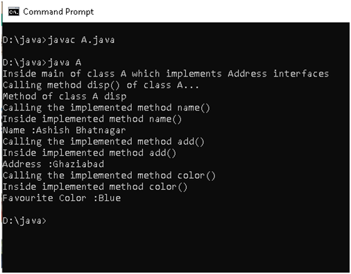 The above program has a class A, which implements the Address interface. Note that coding for all three methods included within the interface has been done in this class. The main() method creates an object of class A and calls each of the three methods. Apart from calling them, it also calls the disp() of class A; note that the implemented methods have been declared public.