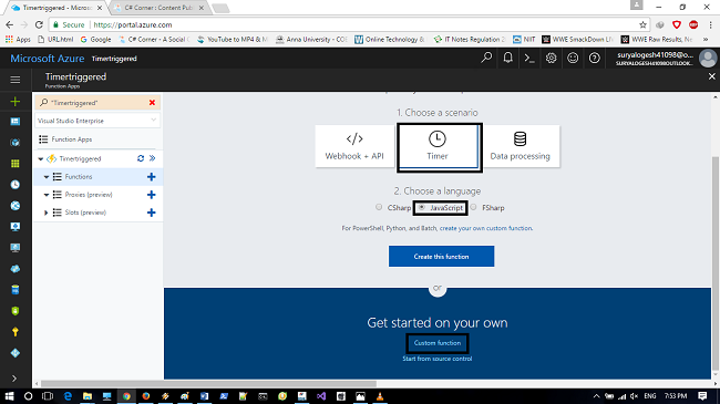 In the functions app, expand the function app and select + button in the functions. Select the scenario with the desired programming language. I have selected JavaScript. You can select the programming template of your own and click Custom Functions for viewing the complete set of function templates of it.