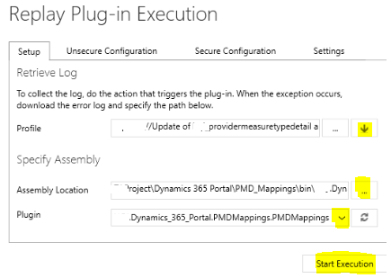 After selecting the assembly, you should select the plugin from the dropdown and click Start Execution. You will find the cursor in the break point in Visual Studio.
