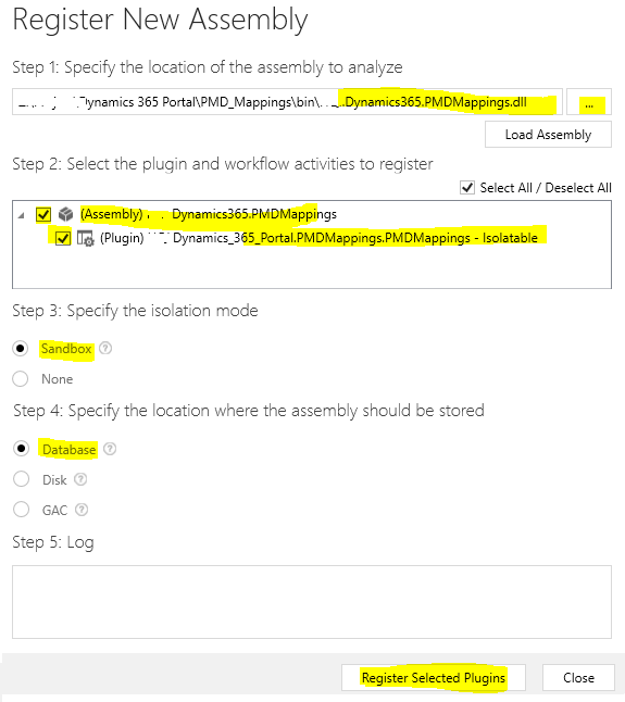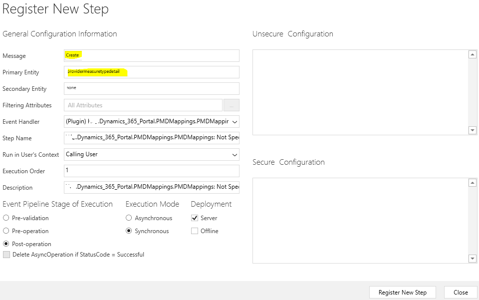 Next thing is to register the assembly (.DLL) as a plugin in Dynamics 365, as shown below.