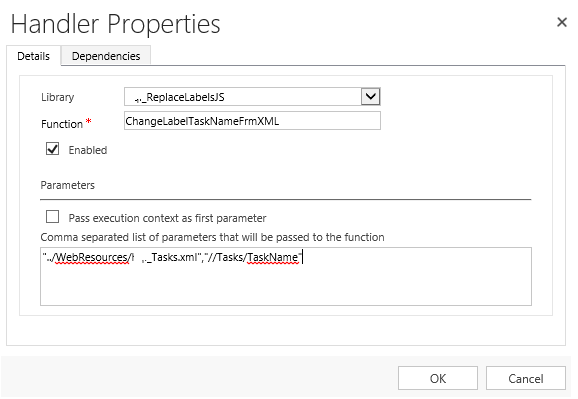 Here, the function name is ChangeLabelTaskNameFrmXML and the parameters are provided as comma separated values.