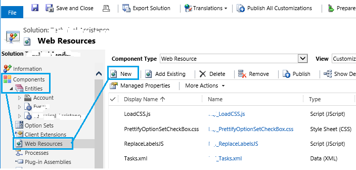 After uploading the files to Web Resources, you must select Entity Form, where the labels must be replaced.