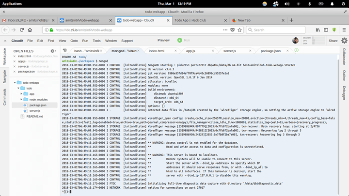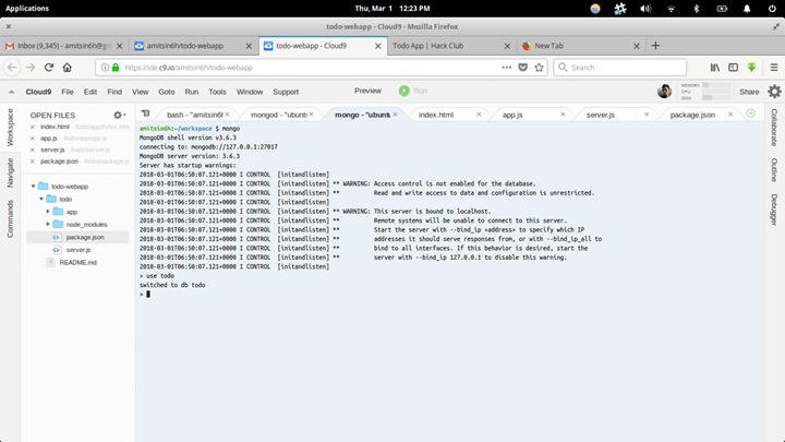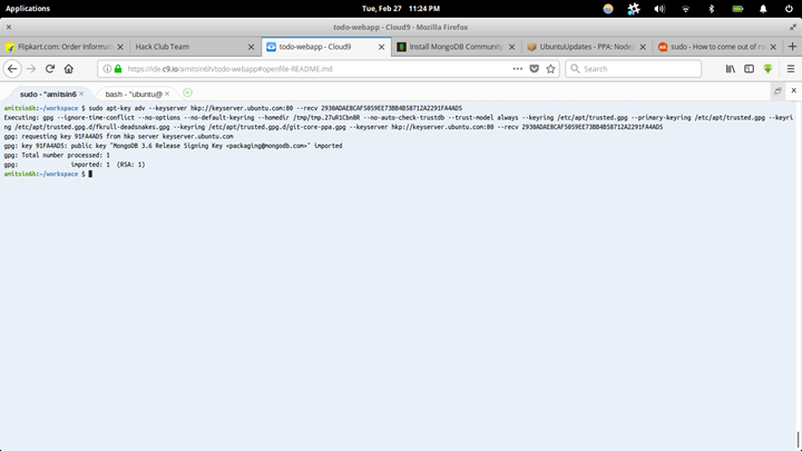 Once we see our server is running now we are required to create database. So quickly move into a new terminal tab and run the below command for creating a database using MongoDB.