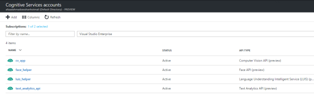 Figure 1 List of the Cognitive Services associated with the account.