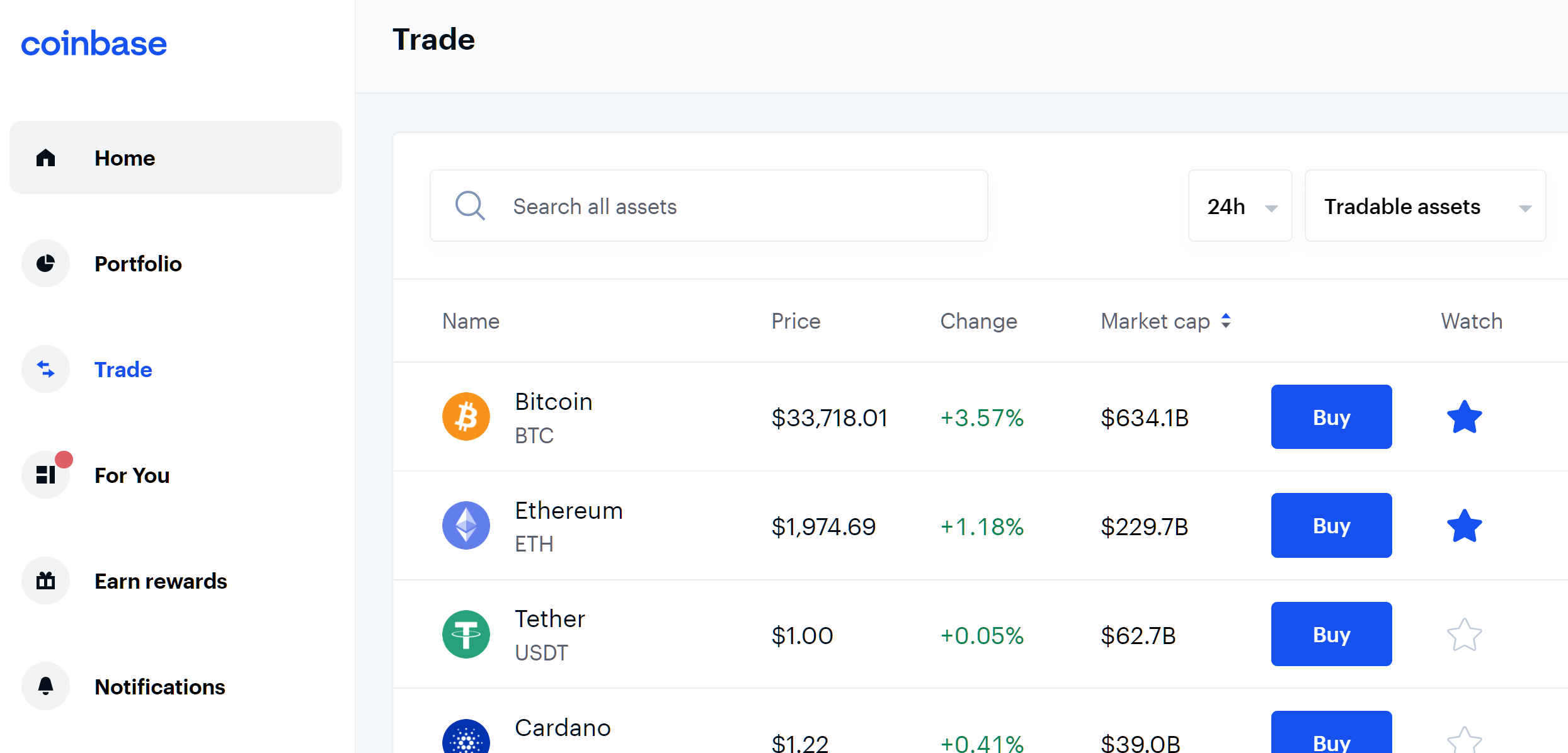 For beginners and retail investors, Coinbase.com and Coinbase app provides a simple and easy-to-use interface. The website and app, both have simple navigation and easy options to trade crypto. The Trade page shows various crypto assets listed on the exchange with their current price, market cap, % change, and Buy option.