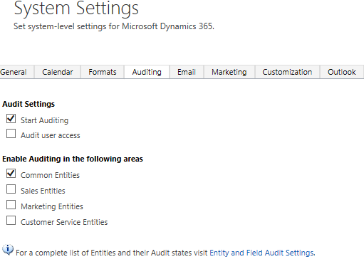 We can enable auditing by navigating Settings-> Auditing, from this area we can enable global auditing setting for your organization, entity auditing for entity and respective fields, view audit summary and can also work with audit logs. Click on Global Audit Settings option to enable auditing, this will open Auditing tab under System Settings dialog. Click on Start Auditing and Common Entities check box to enable auditing for common entities. It will enable auditing for the following entities,
