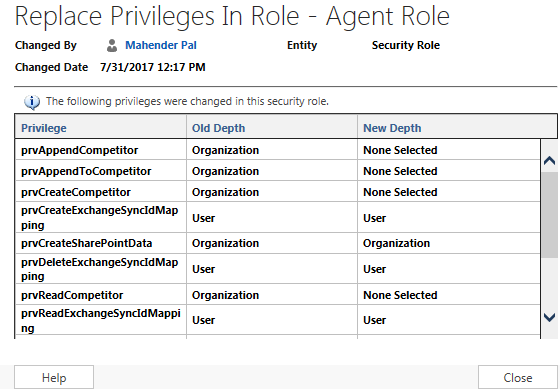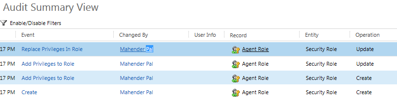 After that, we can click on "Entity and Field Audit Settings" to enable auditing at entity and field level. In our case, we want to use auditing feature for security role entity so this will be enabled already. Now open any security role and do some changes, or create new security role. Once done with changes navigate to Settings->Auditing again and click on Audit Summery View, we should be able to see our changes like following,
