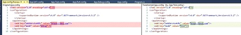 The Add Transform will add the available configuration environment app.config (like for Test the config file will be added as App.Test,Config) files under the "App.config"