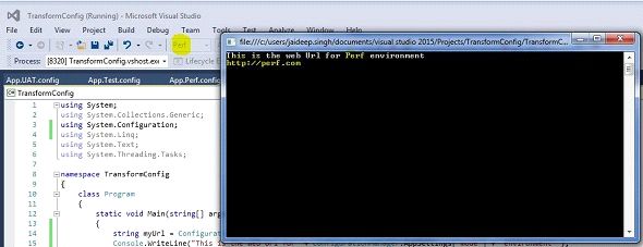To demonstrate this I have created a console application which will transform config using slow cheetah. I have followed the above steps and added the three Configuration environments "Perf","Test" and "UAT". And based on the configuration environment selected in my demo the url value gets changed.