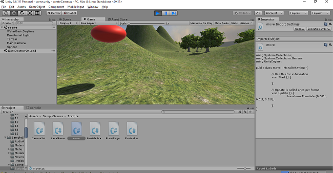 Save the program. Go to Unity and click on the Play button. The sphere will be moving slowly to the right.