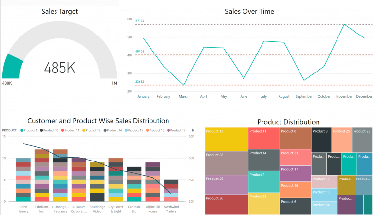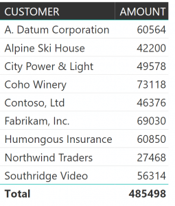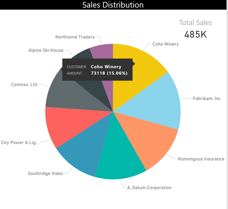 However, converting this report into a pie chart would make it more understandable and appealing to the eye. Also, with visualization tools like Microsoft Power BI, much more information can be layered on to the existing data. In this example, the proportion of the total sales for each customer can be recognized easily along with displaying the sales percentage per customer.