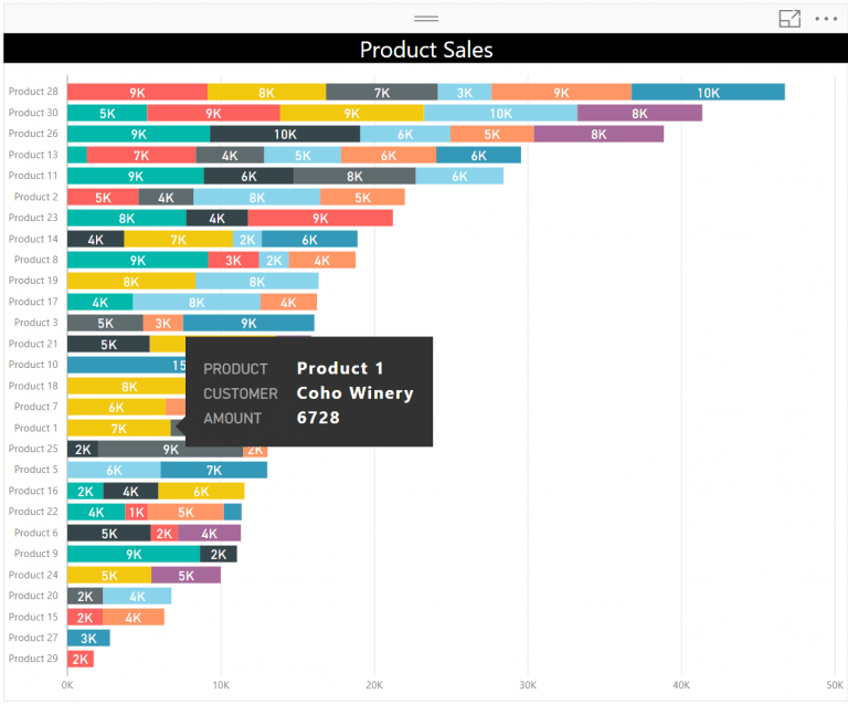 But when I now look at this visual, I can see every detail at a glance. I know that Product 28 brings in the most money why product 29 brings in the least. Also, I am able to see the amount and the number of customers each product had at a glance.