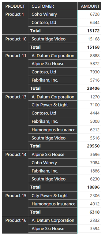 Moving on to a slightly complex tabular report (Not a table as per the definition in data science), we have a report on sales of different products along with the contribution of each customer for the particular product. As the number of products increase, the report will grow longer and longer.
