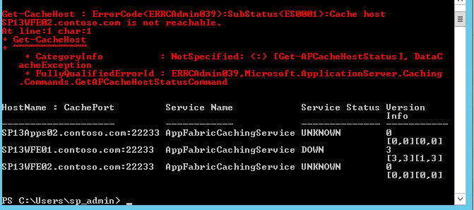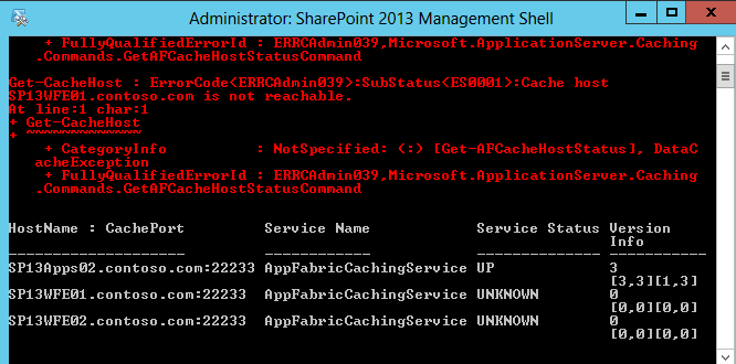 Error: SubStatus(ES0001): Cache host SP13WFE01.contoso.com is not reachable. Error: SubStatus(ES0001): Cache host SP13WFE02.contoso.com is not reachable.