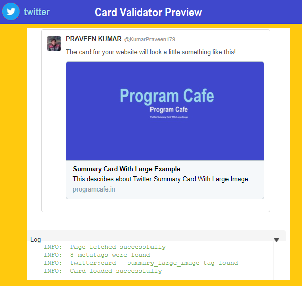 As with card validator preview, it will look the same as our Twitter timeline after tweeting this page by following the same step as the Twitter Summary Card.
