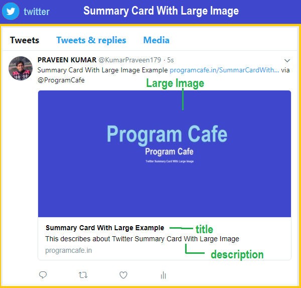 In the above code snippet content="summary_large_image" indecates the type of card used on this page. As with "Summary Card" card properties, twitter:card and twitter:title properties are required.