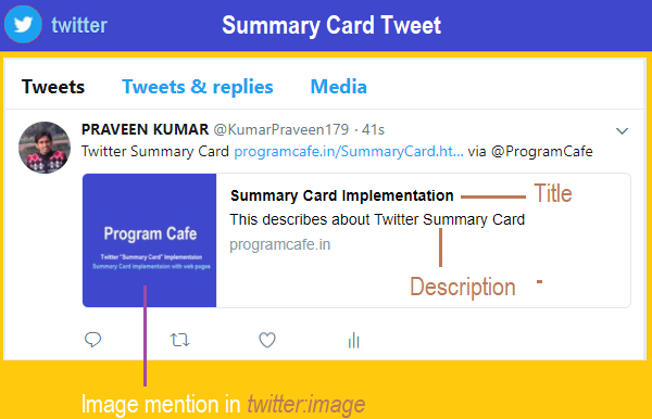 Summary card is a kind of twitter card which allows us to show an image with our tweets. Basically, it is designed to give the reader a preview of the content before clicking through to your website.