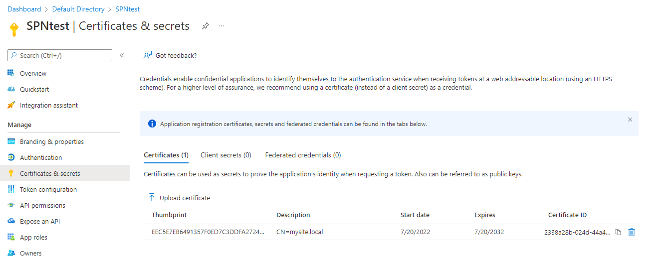 - Select Certificates, then Upload certificate, and select the certificate (an existing certificate or the self-signed certificate you exported).