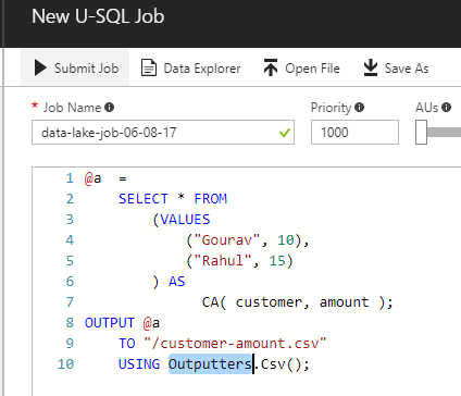 Implementation – Create a U-SQL job and executing U-SQL query on the Data Lake account.