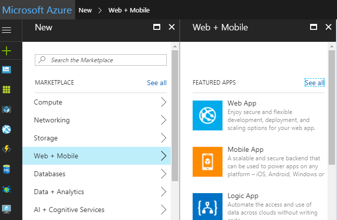 - Open Azure portal, click on the "Add" symbol to add Web+Mobile, and then select the Mobile App.