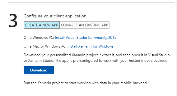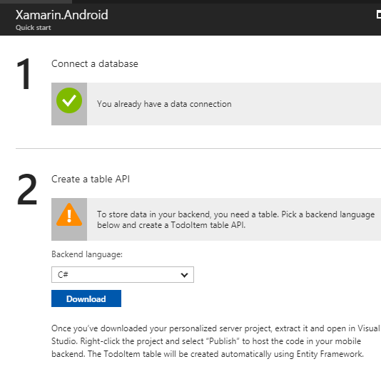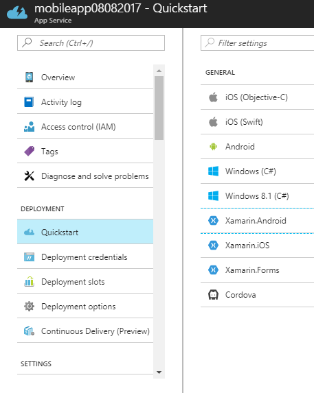 - Open the app-service, click on the “Quickstart”, and choose the Xamarian.Android platform.