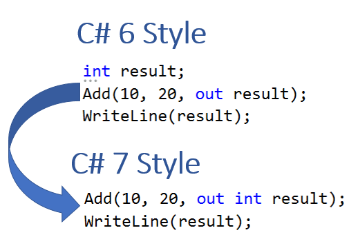 There is no need to declare out variable before passing it as argument and it can be declared inline. This is a new feature in C# 7. Following is a screenshot for the same which explain the difference between C# 6 & C# 7 coding style for inline out variable.![]()