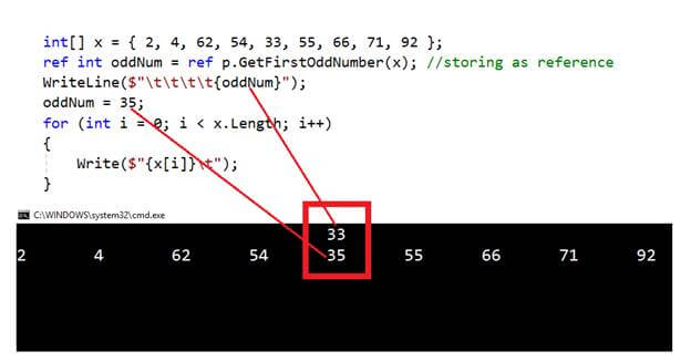 ref int oddNum = ref p.GetFirstOddNumber(x); //storing as reference