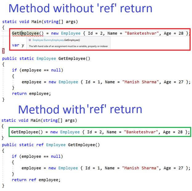 You may be thinking what is the need of ‘ref return’. It can be achieved with ref return also. Let me explain it with some more examples: